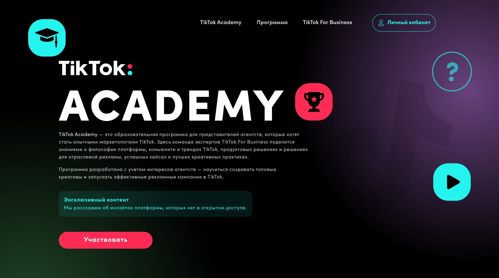 TikTok — платформа коротких видео, 1,9 млрд пользователей (2023). 67% из них чаще взаимодействуют с брендами через TikTok, чем в других соцсетях. Компания стремится развивать образовательные инициативы и делиться аналитическими инструментами с агентствами.